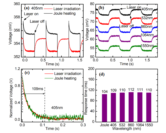 Figure 2. (a) The voltage−time profiles under the 405 nm laser irradiation and the Joule heating (with offset for comparison). (b) The transient response data to laser irradiation of different wavelengths. (c) Comparison of the normalized voltage versus time profiles of the laser irradiation and Joule heating, which confirms that the resistive response to the laser irradiation is a heating effect. (d) The response time to the Joule heating and to the laser irradiation of five different wavelengths.