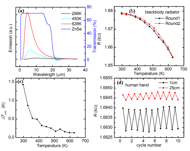 Figure 3. (a) Wavelength-dependent radiation power distribution of the blackbody radiation when its temperature is 298, 450 and 628 K, respectively (left axis), calculated based on the Planck's blackbody radiation. The transmission spectrum of ZnSe windows is presented in the right axis. (b) The CAF sample’s resistance response to the changing temperature of a blackbody radiator (measurement error ≤5%) at 30 cm distance. (c) The minimum detectable temperature against the temperature of the blackbody radiator at 30 cm distance. (d) 10 cycles of resistive response under the influence of a human hand at a distance 25 cm and 1 cm distance from the ZnSe window.
