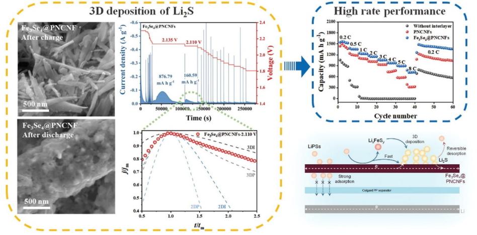 In this study, we designed a composite of porous nitrogen-doped carbon nanofibers loaded with Fe3Se4 (Fe3Se4@PNCNFs) using electrospinning technique and heat treatment. This composite was employed as an interlayer in LSBs to enhance their electrochemical properties. The results indicate that Fe3Se4@PNCNFs exhibit strong adsorption and catalytic effects on LiPS intermediates generated during the charging and discharging of LSBs, thus retaining the LiPSs on the cathode side and mitigating the shuttle effect. Furthermore, the high electrical conductivity reduces interfacial impedance, accelerating the mobility of lithium ions. The interaction mechanism between LiPSs and interlayer materials was also investigated, and the results showed that Fe3Se4 could react with LiPSs, resulting in the formation of a novel polysulfide intermediate known as LixFeSy. This intermediate promotes the 3D deposition of Li2S, thereby enhancing its reversibility and rate performance, thereby offering a novel approach for improving LSB performance. After assembling Fe3Se4@PNCNFs as an interlayer in LSBs, they not only exhibited favorable capacity retention at low currents densities, but also remarkably maintained ultra-high specific capacity at high currents densities under the influence of polysulfide intermediates.