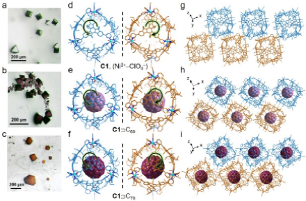 Figure 2. X-ray crystallography study of metallo-cages and cage-fullerene complexes. (a-c) Images of C1, C1ÉC60, and C1ÉC70. (d-f) Crystal structures of C1, C1ÉC60, and C1ÉC70 with a pair of enantiomers. (g-i) Packing modes of C1, C1ÉC60, and C1ÉC70 (hydrogen atoms, solvents and disordered counteranions are omitted for clarity).
