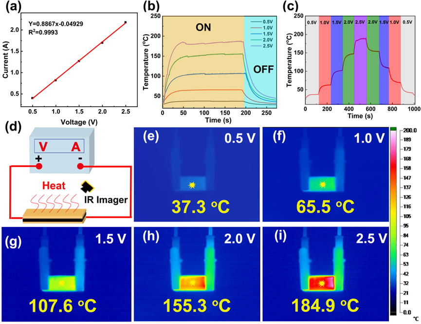 CF/4.5T-5M/PEEK复合材料具有稳定的电热转换性能,2.5 V电压下稳态温度可达184.9 ℃,响应速度快(50秒内达到稳态温度),温度可调范围广(30-180 ℃);相同电压下,可在196秒内完全融化冰层,除冰速率达0.612 g·min⁻¹,远优于纯CF/PEEK复合材料(698秒);