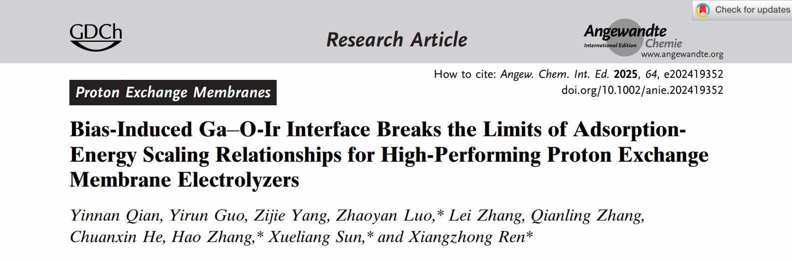 任祥忠教授团队在化学领域顶尖期刊《Angewandte Chemie International Edition》(影响因子16.6,中科院JCR 1区,TOP期刊)发表了题为《Bias-Induced Ga O-Ir Interface Breaks the Limits of AdsorptionEnergy Scaling Relationships for High-Performing Proton Exchange Membrane Electrolyzers》的研究论文。该团队博士生钱音男为论文第一作者,好色视频