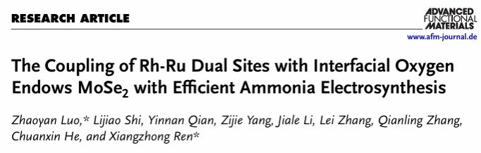 任祥忠教授团队在材料领域顶尖期刊《Advanced Functional Materials》(影响因子19,中科院JCR 1区,TOP期刊)发表了题为《The Coupling of Rh-Ru Dual Sites with Interfacial Oxygen Endows MoSe2 with Efficient Ammonia Electrosynthesis》的研究论文。好色视频