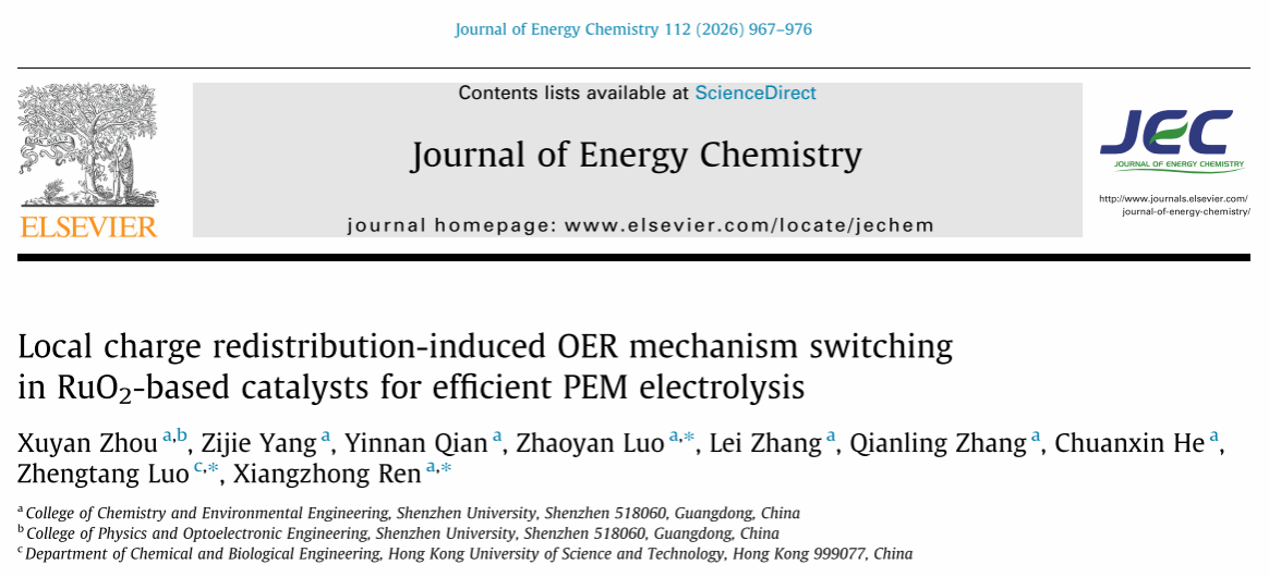 任祥忠教授团队在材料领域顶尖期刊《Journal of Energy Chemistry》(影响因子14.9,中科院JCR 1区,TOP期刊)发表了题为《Local charge redistribution-induced OER mechanism switching in RuO2-based catalysts for efficient PEM electrolysis》的研究论文。好色视频