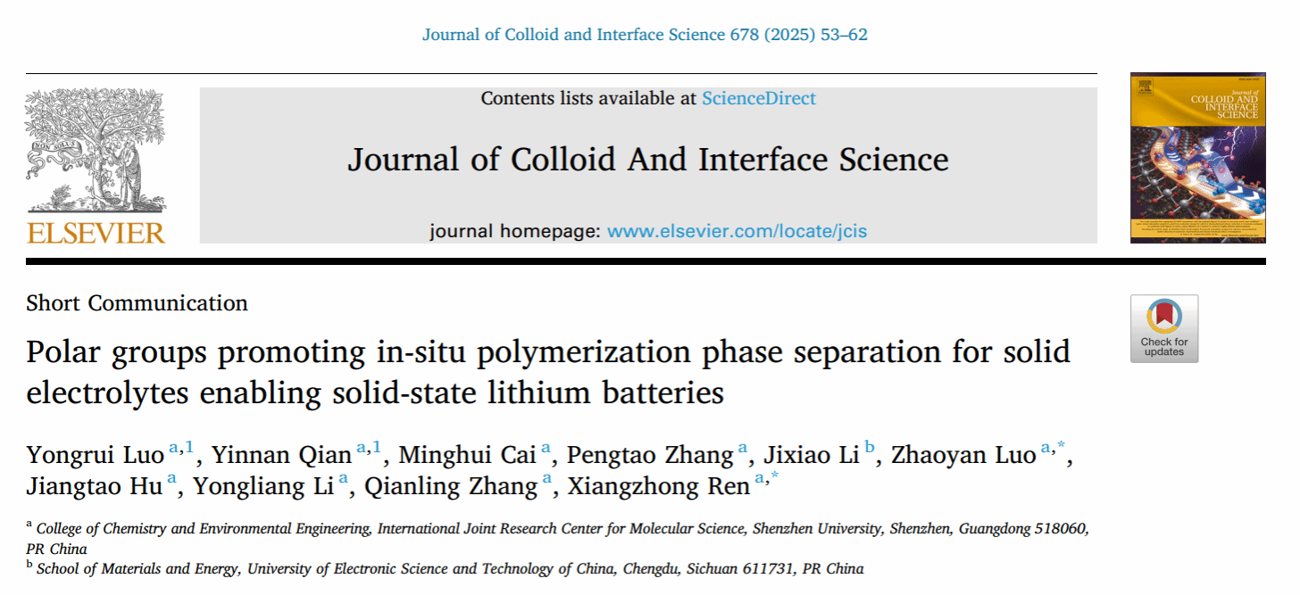 任祥忠教授团队在国际能源领域著名期刊《Journal of Colloid And Interface Science》(影响因子9.4,中科院JCR1区,TOP期刊)上发表了题为《Polar groups promoting in-situ polymerization phase separation for solid electrolytes enabling solid-state lithium batteries》的研究论文。该团队硕士生罗永睿和博士生钱音男为共同第一作者,任祥忠教授和罗兆艳助理教授为共同通讯作者,好色视频